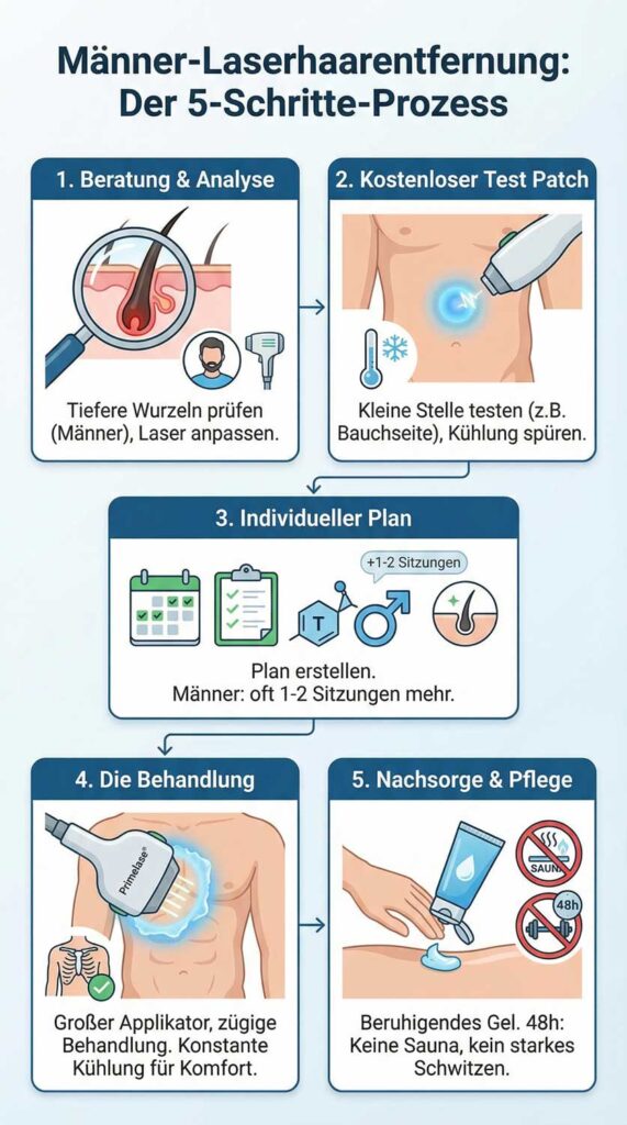 Wir prüfen die Haardicke und Dichte. Männerhaare sind oft tiefer verwurzelt als Frauenhaare, was wir bei der Einstellung des Lasers berücksichtigen.